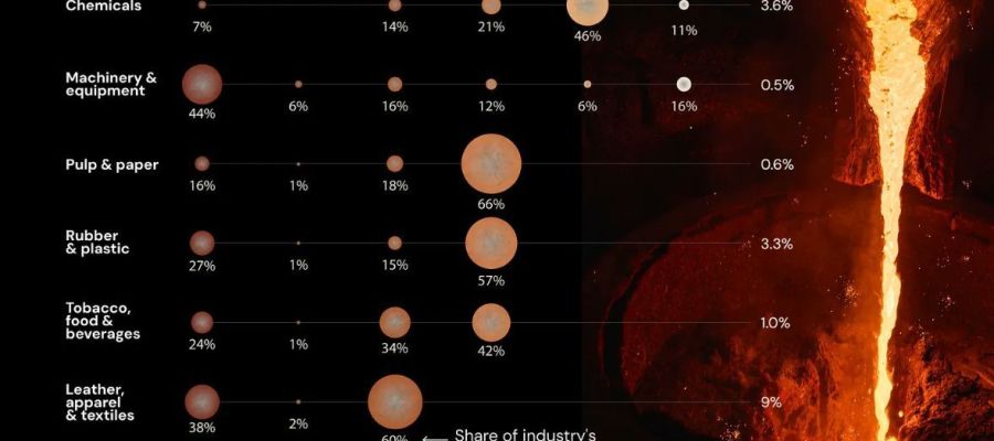 La descarbonización del calor industrial es un reto importante en el camino hacia la reducción de emisiones en industrias. El 32% del consumo global de energía se utiliza en la industria, y el 74% de este consumo energético se destina a la producción de calor, según la Asociación mundial de Energía (AIE). Dos tercios de este calor se destina a alimentar procesos con temperatura superior de 150ºC, como la destilación, coloración, blanqueado, o los procesos de transformación de materiales. La gráfica de Orennia arriba muestra una descomposición más detallada al consumo de diferentes sectores, junto con su importancia en las emisiones de gases de efecto invernadero.
